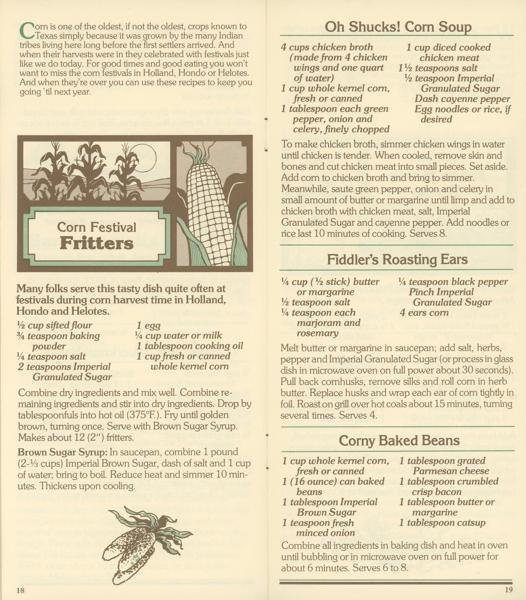 Seventh printing. 9" x 4" in pictorial wrappers showing color photographs of various places in Texas. 32 pp. Pages 1-7 offer information about Texas and its harvests and festivals; pages 8-31 offer recipes; and page 32 offers information about Imperial Sugar. Near fine with light wear to the extremities.