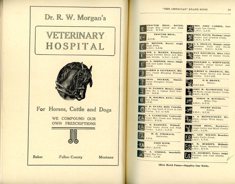First edition. Tall 8vo. Original stapled, printed, stiff wrappers, 167 [1] pp., introduction, illustrated from brands and advertisements, plus additional advertisements on a bound-in sheet of orange colored paper. A scarce Montana brand book, covering stock located in eight counties in the eastern portion of the state, and published in Miles City, the seat of Custer County. This copy bears the name of Paul Renn, an early settler of Prairie County, on the front wrapper. By the time this brand book was published, Renn was among the wealthiest men in Prairie County, and his brands are listed herein, along with those of hundreds of male and female cattle owners in eastern Montana. The brands are listed alphabetically for the entire region, and each brand is illustrated. The introduction is by Custer County Sheriff A.B. Middleton, who played a large role in compiling the brands, endeavoring to make the list as thorough and accurate as possible. This volume also includes ads for dozens of businesses in Miles City, Billings, and elsewhere in Montana. Not in Adams’ Herd. OCLC locates five copies, at Yale, the Glendive Public Library, Montana Historical Society, Montana State University, and the Kohrs Memorial Library in Deer Lodge. There is also a copy at the University of Montana. Covers are lightly used, spine protected with modern cellophane tape, former owner's name (Paul Renn) boldly written on the front cover, and some minor notes in pencil in the margins, else a very good, solid copy.