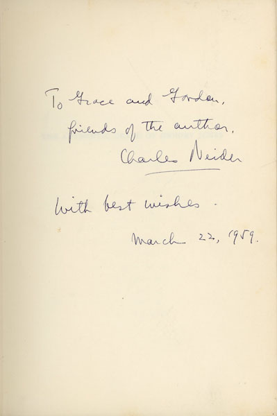 First edition. 8vo. Inked gift inscription on the front free fly leaf :"To Grace and Gordon / friends of the author / Charles Neider / With best wishes / March 22, 1959." Two-tone black quarter cloth and brown cloth, titles stamped in white on the spine, [8], 205 pp. This book is the basis for the 1960 Western film "One-Eyed Jacks," directed by and starring Marlon Brando. The film draws heavily on the legend of Billy the Kid, particularly Billy's relationship to Pat Garrett. One-Eyed Jacks is the only film directed by actor Marlon Brando. The cast also included Ben Johnson, Katy Jurado, and Pina Pellicer. Novelist/screenwriter Calder Willingham collaborated on the script. Sam Peckinpah, would go on to direct his own version of this story in 1973 entitled Pat Garrett and Billy the Kid starring Kris Kristofferson. The story begins in Sonora and after a bank robbery, Rio, aka the Kid, is betrayed by his companion Dad Longworth, who runs away with the loot. Five years later, the Kid escapes from jail and crosses the plains and deserts of Mexico and California to kill him. Fine, bright copy in a bright, fresh dust jacket with minor wear to the spine ends and extremities.