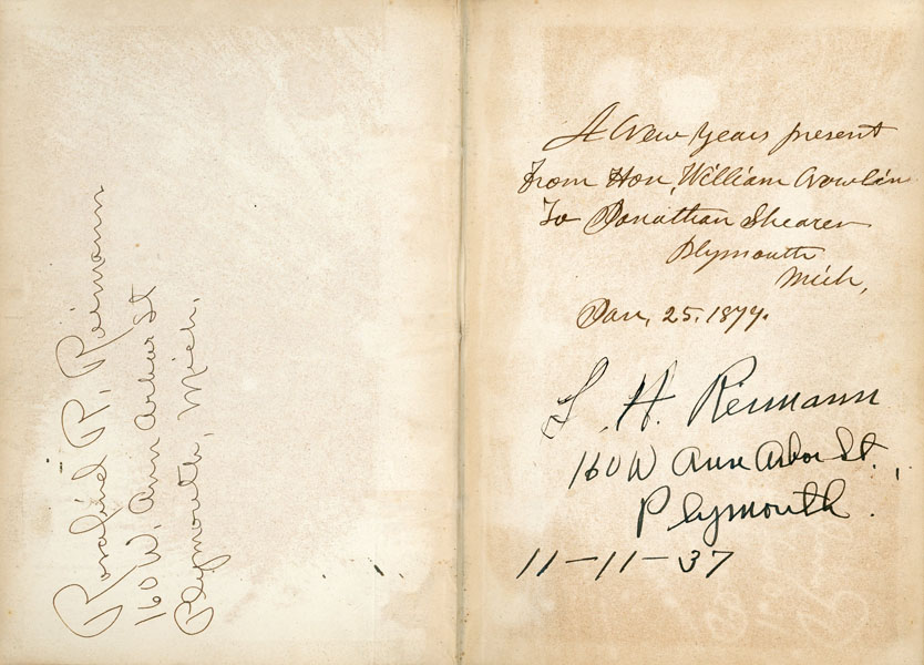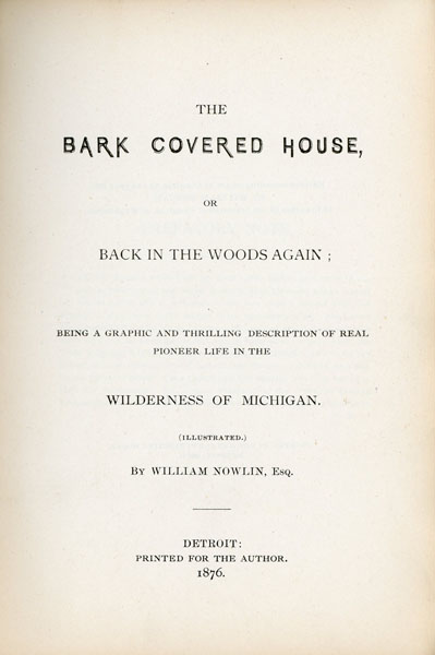 First edition. 12mo. Inked gift presentation inscription on the front free fly leaf that is signed and dated by the author. The inscription reads: "A New Years present from Hon. William Nowlin to Jonathan Shearer, Plymouth, Michigan, Jan. 25, 1879." Purple cloth, titles in gilt on the front cover and spine, front cover and spine decorations in black, xiv - 250 pp., prefatory note, preface, illustrated, plates. A thrilling description of real pioneer life in the wilderness of Michigan. An account of events taking place from the 1830s to the 1890s. Nowlin describes his father taking his family into the wilds of Michigan in 1834. His father had a farm in upstate New York and was seeking better land and opportunities to advance economically. He bought land near Dearborn, Michigan in virgin forest. Here they would have to fell the forest manually with an axe in order to create a clearing for farming operations. Events described include building cabins, the land, hunting, farming, the building of the railroad, and the cost of necessities. Howes N217 says "Best picture of pioneer Michigan." Former owner's inked name and address on front pastedown sheet and front free fly leaf, cloth lightly rubbed, light wear to the spine ends and corners, else a very good copy.