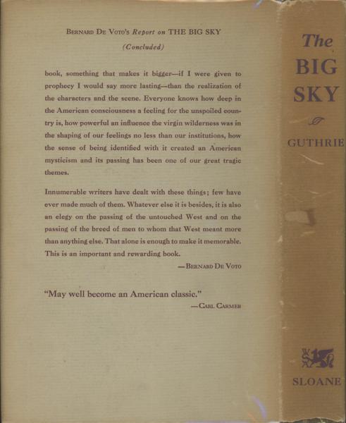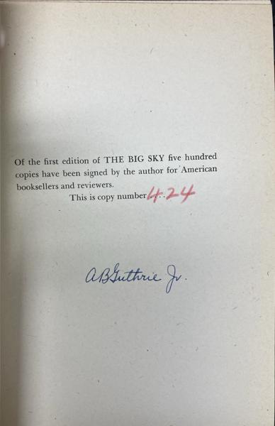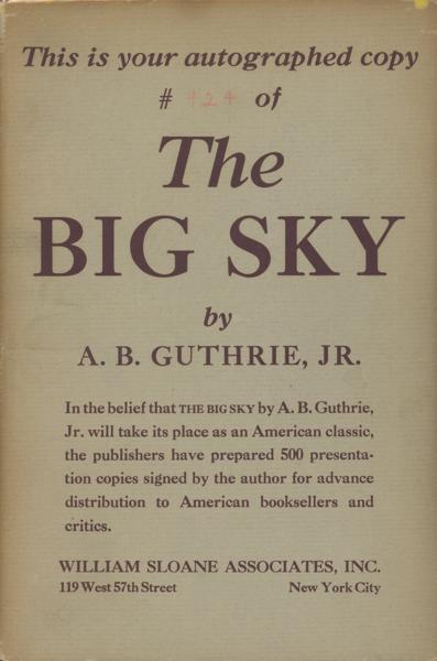 First edition. 8vo. Cloth. 386pp. Author's second book. One of 500 numbered copies with an extra leaf signed by Guthrie tipped-in. This copy includes the special plain grey advance dust jacket which bears the limitation number at the top of the front panel. This is copy number 424. A Jeff Dykes Western High Spot and a 1948 Pulitzer Prize nominee. The 1952 film adaptation directed by Howard Hawks received two Academy Award nominations. First in Guthrie's series about the American frontier. Follows Boone Caudill as he leaves Kentucky to become a mountain man in the 1830s West. He, along with Jim Deakins, a good-natured wanderer, and the seasoned mountain man Dick Summers, travel up the Missouri River on a keelboat expedition, encountering Native American tribes, fur traders, rival trappers, and the stark dangers of frontier life. The book is known for its realistic portrayal of the era, focusing on the lives of fur trappers and explorers, and is considered a classic of the Western genre. A. B. Guthrie gives us an unforgettable portrait of a spacious land and a unique way of life. Fine bright copy in a bright dust jacket that is toned on the spine and with light wear to the spine ends and corners. Housed and protected in the original custom slipcase.