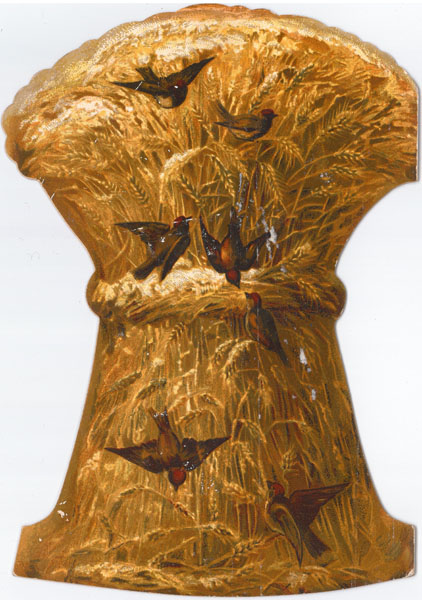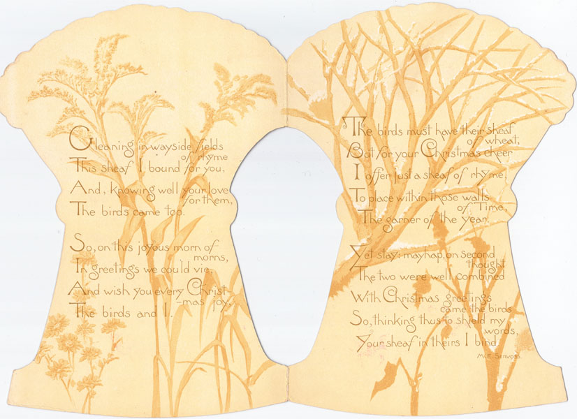First edition. A Christmas greeting card on die cut, chromatographed paper. 7-1/2" x 5." 4 panels. The front and rear panels are colored pictures of sheaves of grain. Inside 2 decorative panels is a poem by M.E. Servoss. The interior panels offer illustrations of wheat on one side and snow-covered tree branches on the other. Light wear to the extremities else very good.