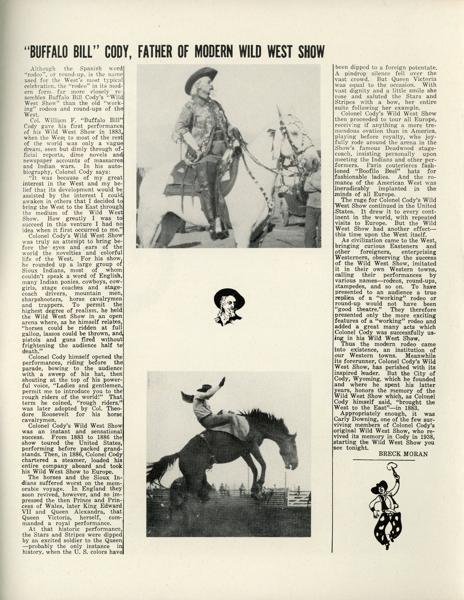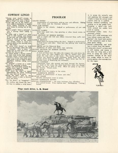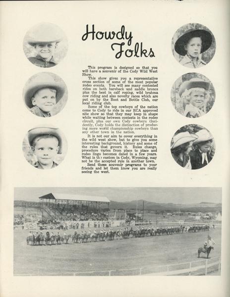 11" x 9" pictorial wrappers. 4to. This is Vol. 3, No. 1, Summer Edition I, Cody, Wyoming, n. d. (ca 1949), n. p. (12 pp. including covers), rodeo events such as wild cow riding, calf roping, saddle broncs, wild horse race, bareback riding, bull dogging, bull riding, illustrated from photographs.