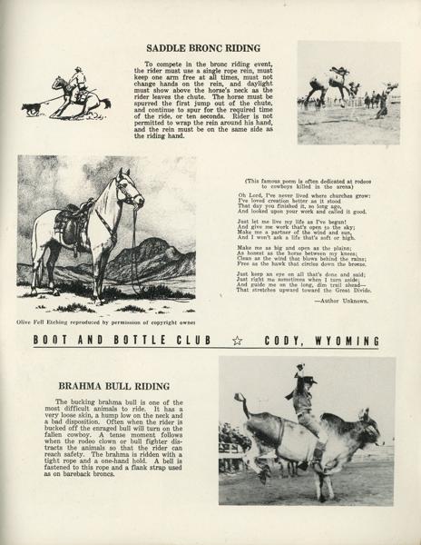 A promotional booklet promoted by the Boot and Bottle Club of Cody, Wyoming encouraging tourists to come to Cody and see all of the action of the nightly rodeo. Full-page article on Buffalo Bill Cody. Also an Olive Fell etching and parts of the Badger Clark poem A COWBOY PRAYER which was first published in 1906. Also definitions of cowboy lingo are also provided Very good copy.