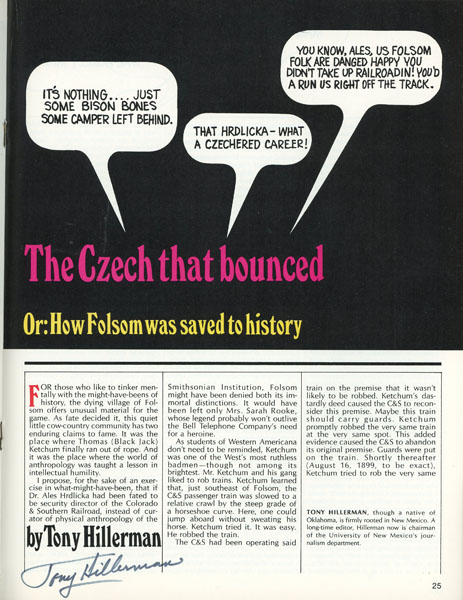 First edition. 4to. Story appears in Winter 1971 issue, January / February 1971, Vol. 50. Nos. 1 - 2. Color pictorial wrappers, 48 pp., story appears on page 25 - 27, triple column, illustrated, inked signature of Tony Hillerman. An essay about Folsom, New Mexico and the Czech, Ales Hrdlicka, who helped to promote it. Also contains "The Mustangs of Lucero Mesa" by John L. Sinclair; "The Bookish Black at Wild Horse Arroyo" by Jaxon Hewett; "The Quest for High Places: Mountain Climbing in New Mexico" by Jack Kutz; etc. Fine copy.