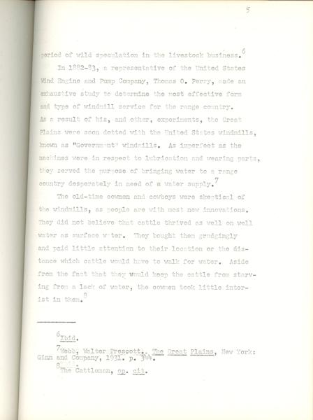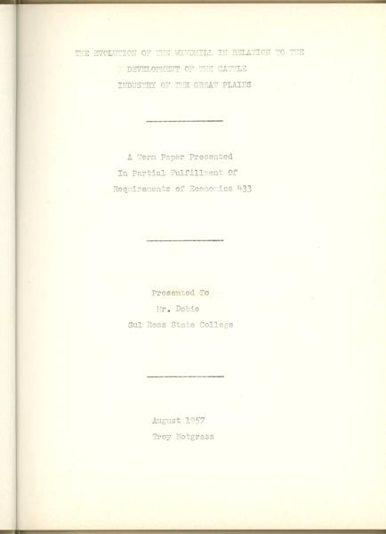 First edition. 4to. Unprinted binder, [3], 8 [2] pp. (each page printed one side only), bibliography, footnotes. This is a term paper presented in partial fulfillment of requirements of Economics 433. Presented to Dudley R. Dobie of Sol Ross State College. Interesting presentation on the windmill and how it has done more in development of the cattle industry in the Great Plains than any other investment made. Many acres of land, previously uninhabitable, now are occupied by thousands of cattle due to the advent of the windmill. Inked name of the author and title of this term paper on the front cover plus the word "personal" also written in ink else a fine copy of the author's term paper.