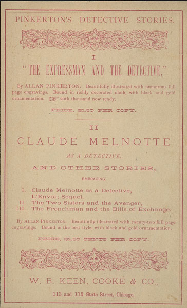 First edition. 8vo. Author's first book. Maroon cloth, titles stamped in black on the front cover with "We Never Sleep" logo stamped in gilt on the front cover and titles stamped in gilt on the spine, light yellow front and rear endpapers, [7] - 9 - 278 pp., preface, frontispiece, illustrated, plates. All tissues present. Laid-in to this copy is a promotional slip from the publisher promoting this book and advising the titles of the next three titles written by Pinkerton and in the works for publication. The first book by Pinkerton and the company was one of the first to use the term "private eye." The contents are all true stories of his life as a detective. A Haycraft-Queen Cornerstone. Lightly rubbed at spine ends and corners else a very good copy.
