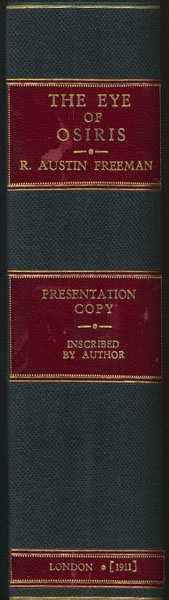 First edition. Author's second book. Inked inscription on the front free fly leaf : "Heath Hosken / with best wishes from / R. Austin Freeman." Bound in brick-red cloth, stamped in black on the front cover and gold on the spine. This is the second binding, lacking the illustration on the front cover of the first, of which only 150 copies were printed. Corners lightly bumped, trivial fading to the spine and minor wear to the spine ends. A very good+ to near fine copy that is very scarce and rare signed. Housed in a custom clamshell case with red leather spine labels and titles stamped in gilt. Dr. Thorndyke mysteries.