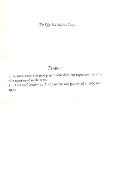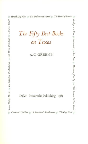 First edition. 8vo. One of 200 copies offered for sale and signed by A. C. Greene and David Holman. This is copy 59. Two-tone quarter cloth and decorated paper over boards, [10], 90 [1] pp., introduction, illustrated, erratum. The author selects and gives detailed reasons for his selections. Well-written and informative. A fine, bright copy.