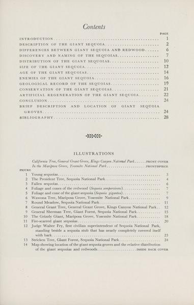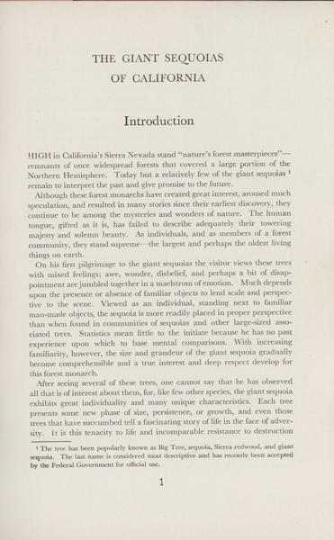 First edition. 8vo. Pictorial wrappers, [4], 28 pp., introduction, illustrated, map, bibliography. An interesting history and description of the Giant Sequoias. Cook discusses the ecology, growth patterns, and impressive size and longevity of the sequoias, some of which are among the oldest living organisms on Earth. He traces their discovery by European Americans, the early days of exploitation and logging, and the evolving movement to protect and preserve these natural wonders. Faint crease to bottom edge of front panel, else very good copy.