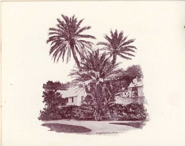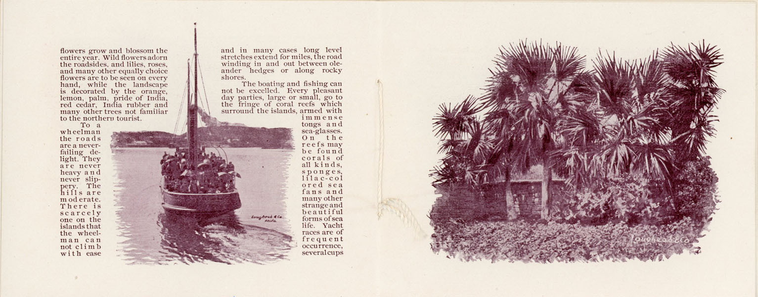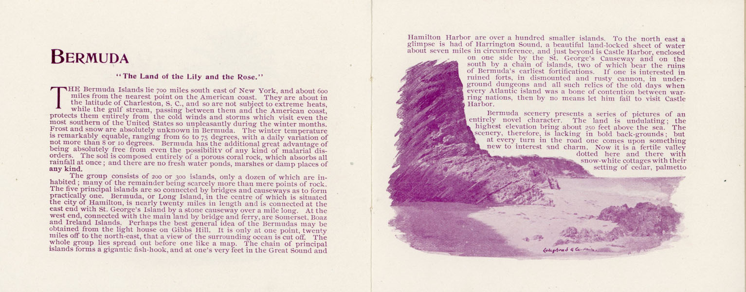 First edition. 3 3/4" x 4 3/4" in cream colored pictorial wrappers with an illustration of The Hamilton Hotel printed in green ink on front wrapper. Tied at spine. Text and illustrations printed in burgundy. [12] pp. Information on Bermuda, its scenery, their roads, boating, fishing, its military, the Quebec Steamship Company, as well as about The Hamilton Hotel. 1" split to head of spine; 1/4" split to toe of spine along with light soiling. Very good plus.