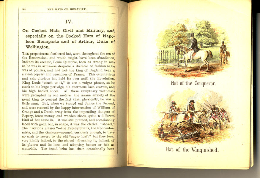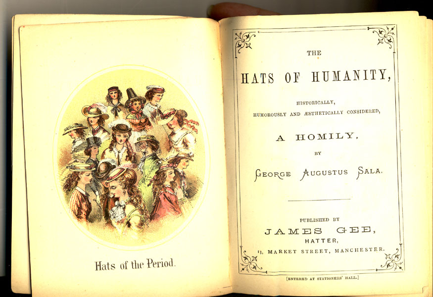 First edition. 4" x 5 1/4" color, pictorial, stiff wrappers, 60 pp., preface, 4 lithograph color plates, including the frontispiece. An interesting and humorously presented promotional book in 1868 by James Gee of Manchester, England. The text covers hats historically, women's hats, men's hats, and cocked and military hats. Light wear to the spine, else a very good copy.