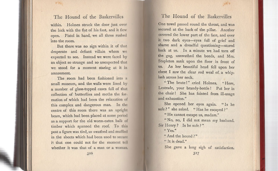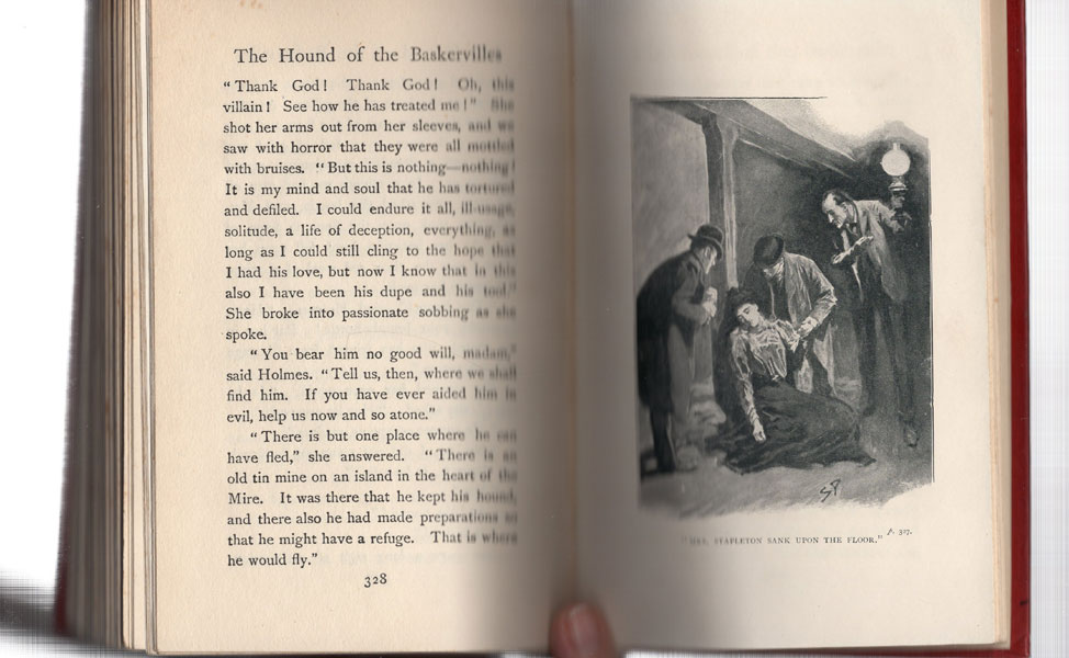First edition. Bound in the publisher's original red cloth with gilt decorations and lettering on the front cover and spine. Sixteen full-page illustrations by Sidney Paget. Former owner's inked name and street address on front fly leaf and inked initials on front pastedown sheet, minor wear to spine ends, top edge lightly soiled, else a near fine, bright, clean copy of a mystery classic. When Sir Charles Baskerville is found dead on the wild Devon moorland with the footprints of a giant hound nearby, the blame is placed on a family curse. It is now up to Holmes and Watson to solve the mystery of the legend. Housed in a bright cloth clamshell case, with a hound like the one on the book's front cover on the front panel and titles stamped in gold gilt on a leather spine label. An attractive presentation. A Haycraft/Queen Cornerstone title.