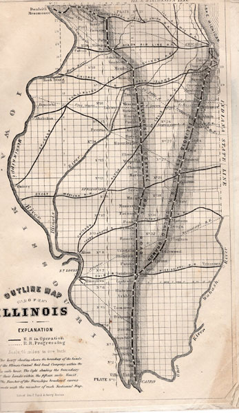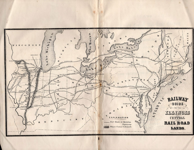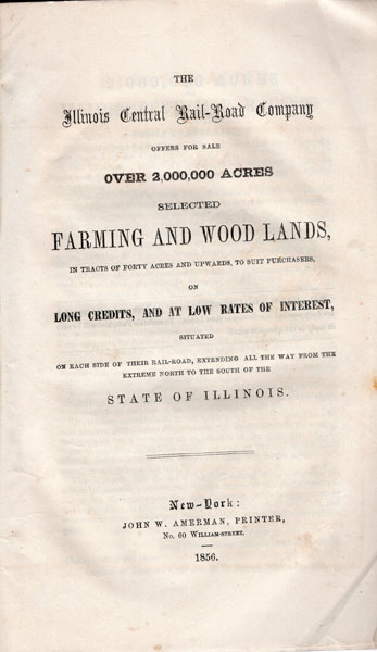 9" x 5-1/2" tan printed wrappers. 64pp. Two black and white frontispiece maps. The first map is 9" x 5-1/2" and is entitled "OUTLINE MAP OF ILLINOIS." The second map covers 2 pages, 10-1/2" x 6-3/4" and is entitled "RAILWAY GUIDE TO THE ILLINOIS CENTRAL RAIL ROAD LANDS." Everything you would want to know about settling down in Illinois is in this booklet to include railroad routes, value of land for farming, value of crops, towns and villages. The Company owns valuable tracts of iron and lead ores, also coal beds of immense richness. "Illinois Is now in the start of its great advance towards becoming the first producing State in the Union. Having Lake Michigan on one side, furnishing a constant outlet for its produce, the Mississippi to the west, with its tributaries, the Illinois and Rock Rivers, both navigable streams, running far into its interior, the Wabash on its eastern borders, and Ohio on the south, the natural facilities would seem unequaled in the world." Several letters from successful farmers telling of the advantages and prospects of Illinois. Other subjects discussed are the climate, soil, health, coal, Illinois Central Railroad Lands, the cost of opening a farm, the population, agriculture, statistics of towns et. al. Light wear to the extremities along with chipping to spine, lower fore-corner of front wrapper creased, wrappers discolored else a good+ copy.