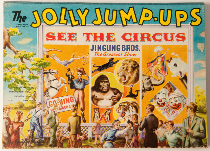 First edition. Oblong 8vo. Pictorial paper over boards, illustrated. Contains six color pop-ups showing intricate scenes at the Jingling Brothers Greatest Show. The pop-ups are all complete and in fine condition. Pages are clean and free of markings. Published at the heighth of World War II this copy is lightly rubbed at the corners and extremities, with light wear to cloth spine ends, else a near fine copy of an interesting children's book.