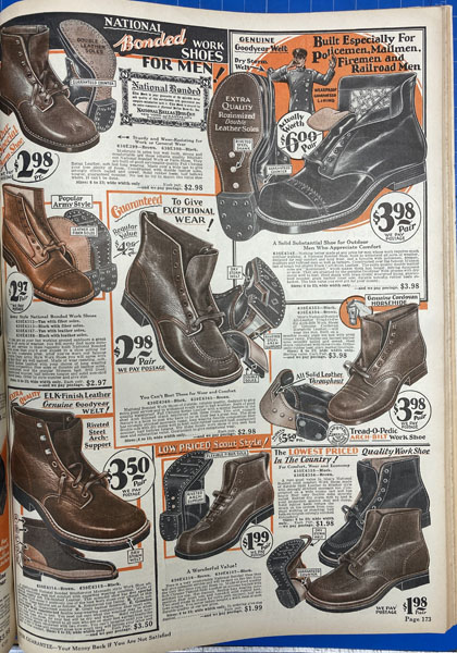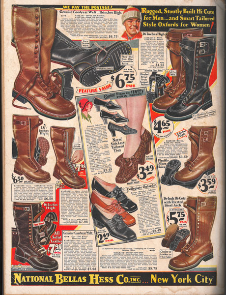 First edition. 14" x 10-1/2" pictorial wrappers. Quarto. 306 pp. including wrappers. The front wrapper is a very colorful and striking picture of the hustle and bustle of 42nd Street and Times Square. The rear colorful wrapper shows many different types of shoes for men and women. The company was founded in the late 1800s as the National Cloak & Suit and was renamed National Bellas Hess Company around 1910. It was a mail order seller of various consumer products to include men's, women's, and children's clothing, hats, gloves, shoes, luggage, pens and pencils, cosmetics, jewelry, clocks, watches, silverware, tableware, linen, curtains, dolls, toys, handkerchiefs, blankets, silk, etc. Black and white illustrations throughout as well as numerous color illustrations. Each item is described and prices are shown. Light soiling; 2" closed tear at the top of the spine and the previous owner's name written in light ink along with the date. Light wear to fore-edges and a few short closed tears else a beautiful catalog in very good plus condition.