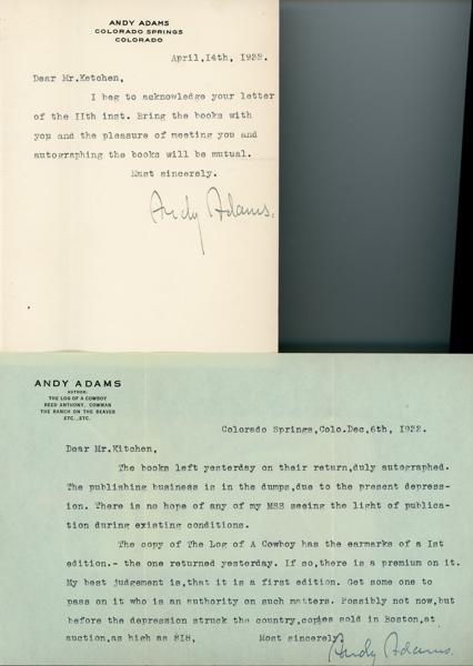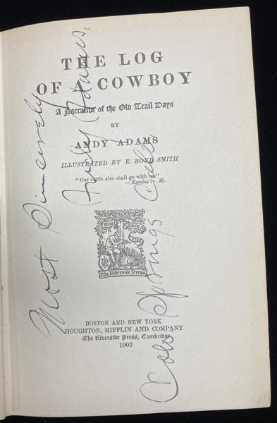 First edition. Author's first book. 8vo. Boldly inscribed in ink on the titles page: "Most Sincerely, Andy Adams, Colo. Springs, Colo." Decorated cloth, [14], 387 pp. frontispiece, five plates. Illustrated by E. Boyd Smith.