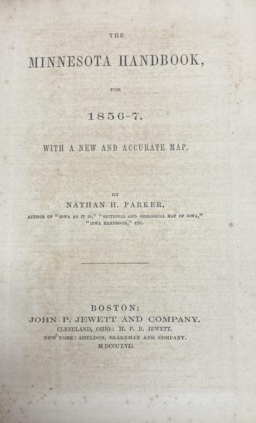 First edition. Red cloth, titles in gilt on the front cover and spine, viii, 9 - 159 [1] pp., preface, appendix. Color folding map of Minnesota by Colton is present and is nicely hand-colored and in fine condition. A mid-19th-century territorial guide and promotional handbook that aimed to inform and encourage settlement in the Minnesota Territory just before it became a state. Information on geography, with an emphasis on fertile land and rich natural resources; towns and settlements and their prospects for growth; advice for emigrants, discussions of public lands, transportation routes, and a large hand-colored map by J.H. Colton, showing Minnesota Territory (extending west to areas that would later become parts of Dakota Territory) with annotated features such as forts, settlements, roads, rivers, and county outlines. Light wear to the spine ends and corners else a very good tight clean copy.