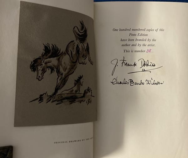 First edition. The very rare "Pinto edition," limited to 100 numbered copies signed by Dobie and Charles Banks Wilson with an original ink and wash drawing of a bucking bronco by Wilson tipped-in opposite the limitation page. This is copy number 38. This is the rarest of Dobie's many books and perhaps this copy is the most desirable copy in the run, designated as number "J" on the limitation page, and thus a copy retained by either the author or the publisher. Six Score 33 says "Certainly the best book on range horses, with much on cattle work. Dobie drew on previously published material from Tales of the Mustang (1936) and Mustangs and Cow Horses (1940). Many feel this to be one of Dobie's best books. Dobie says, "The author has tried to blend vividness with learning." Original red and white colt hide with the hair out, morocco label with titles stamped in gold gilt affixed to the spine, top edges gilt. Fine, bright tight copy housed in the original pictorial, cloth slipcase also in fine condition. An exceptional copy of a choice item.