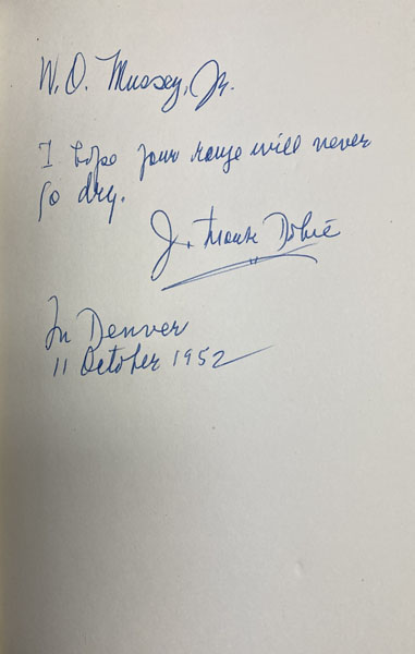 First edition. 8vo. Warmly inscribed on a preliminary sheet "I hope your range will never go dry, J. Frank Dobie, In Denver 11 October 1952." Two-tone pictorial cloth, pictorial endpapers, xvii, [1], 376 pp. Illustrated by Charles Banks Wilson. "The greatest of all books about range horses and rated by many as the best of Dobie's books." --Jeff Dykes. Campbell, p. 130: "Stories of mustangs and mustangers .... This book incorporates Dobie's Tales of the Mustang (1936) and part of Mustangs and Cow Horses, edited by Dobie, Boatright, and Ransom.... Famous mustangs are mentioned and their stories told. We learn of the ways, methods, and hardships of those who caught and tamed wild horses. It is the love of liberty of the wild horse which inspires the author and provides the theme of his book." Dobie, pp. 33, 81, 132, 151, 180. Dobie & Dykes, 44 & 44 #66: "Rated by many as the best of Dobie’s books." Lightly rubbed along lower fore-edge of front cover, else fine in dust jacket, lightly sunned on the spine and with minor wear to the spine ends and extremities. A range classic.