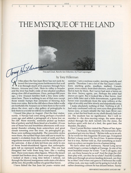 First edition. 4to. Story appears in 75th Anniversary Issue, 1987 issue, January 1987, Vol. 65. No. 1. Color pictorial wrappers, 64 pp., story appears on page 36 - 39, double column, illustrated, inked signature of Tony Hillerman. An essay on the wonderful land formations in New Mexico. Also includes "How Navajo Women Learned to Weave" by Don Dedera; "The Rug That's a Picture - Navajo Pictorial Rugs;" etc. Fine copy.