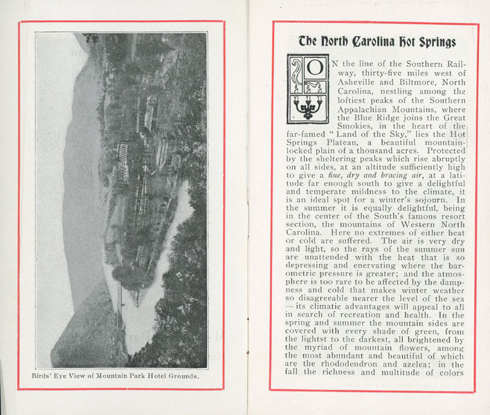 First edition. 16mo. 16 x 9 cm [6 1/2" x 3 1/2"] original red bi-fold pictorial wrappers, printed in black with lettering and small illustrations hand-colored in silver, illustrated with nine full-page and several in-text photographs. A charming pamphlet advertising one of the premier Southern resorts of its day. The 200-room Mountain Park Hotel offered a grand ballroom, billiards, bowling, tennis, riding stables, and a golf course. The Wana-Luna Golf Club (organized 1895, incorporated 1898) was one of the first in the region and employed a "competent professional golf instructor." Guests could take the hot mineral springs in a modern bathhouse that offered massage. The health benefits of the waters (ranging in temperature from 96 to 110 degrees) are touted here, an analysis of their mineral content is provided (by C.F. Chandler and C.E. Pellew), and notice is given of a resident doctor under the direction of prominent Asheville physician, Samuel Westray Battle. However, this was no sanitarium, and the pamphlet announces that "no consumptives will be received." Above all, the Mountain Park Hotel was a "pleasure resort," with social opportunities including dining, card parties, dancing, and music recitals. Guests traveled from throughout the East to visit Hot Springs, which was served directly by the Southern Railway. The pamphlet details the railroad connections from major cities and provides a list of travel agents. Illustrations include a bird's-eye view of the resort, various views of the hotel and grounds, the ballroom, the bathhouse, and the railway. The Mountain Park Hotel was built in 1886 by an investment group, The Southern Improvement Co. In 1891, they sold it to Col. James Rumbaugh, a leading figure in the town and the owner of an earlier hotel in this location. From January to June 1904, the hotel was managed by Edgar B. Moore, here identified as the proprietor, who also ran the Kenilworth Inn in Asheville and the Gladstone on Narragansett Pier, and who leased part of the Biltmore Estate grounds for a hunting and fishing club. An ad for the Kenilworth Inn appears on the final page of this pamphlet. Moore’s brief tenure as manager of the Mountain Park Hotel ended in a nationally publicized controversy. On June 17, John C. Rumbough, acting as agent for his parents, took possession of the hotel, citing the failure of Moore to comply with certain terms of his lease (Rumbough alleged he had not maintained the hotel furnishings and grounds in good order). According to Moore, he was threatened by armed men and unlawfully arrested, which lead to stories such as “Armed Men in Possession of Hotel” (New York Tribune, July 5) and “War of Hotel Men” (New York Times, July 6) and to Moore suing Rumbough for $50,000 for damages and false arrest. Rumbough denied Moore’s allegations and characterized his actions as peaceful and lawful. He managed the hotel briefly before finding another proprietor. The Mountain Park Hotel was destroyed by fire in 1920 and never rebuilt. Remnants of the foundation can be seen on the grounds of the present-day resort. Modest wear to the right upper corner and light creasing to the lower edge of the first leaf, else a lovely fine copy and an important North Carolina landmark.
