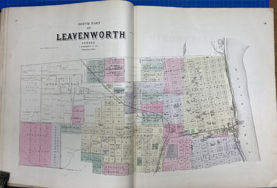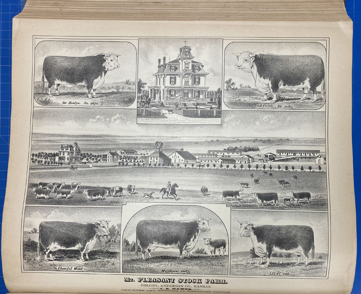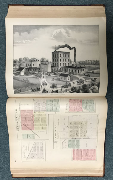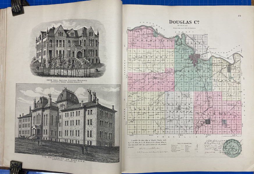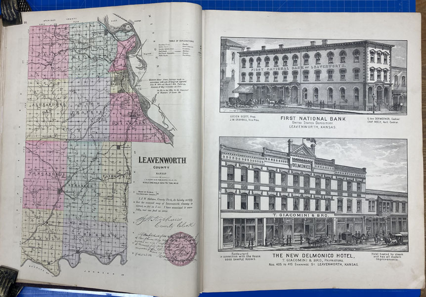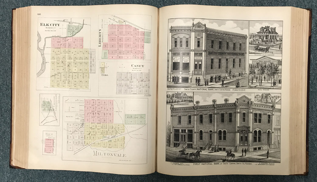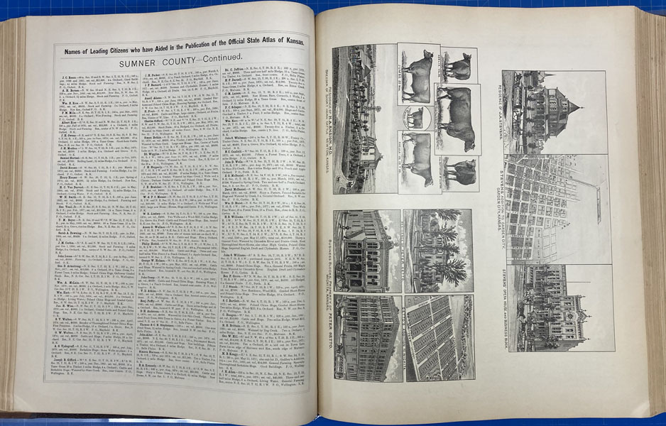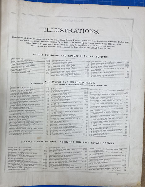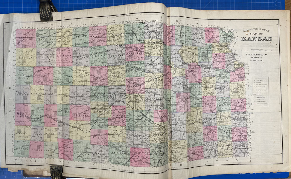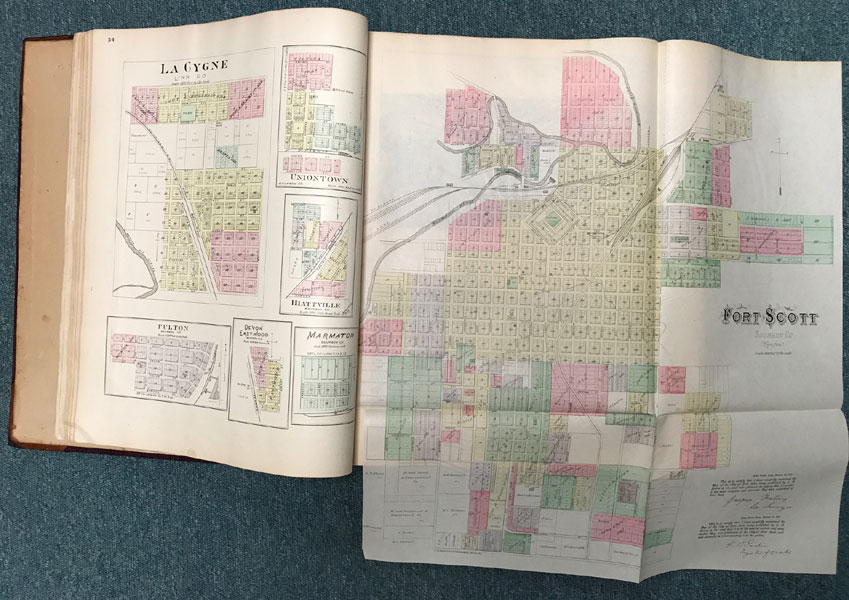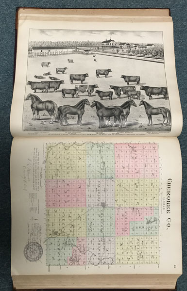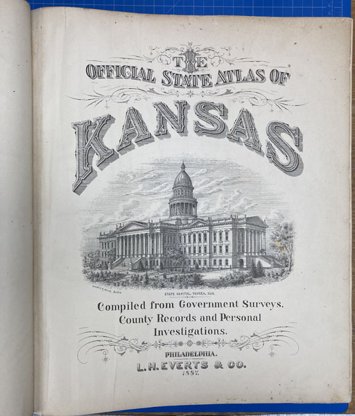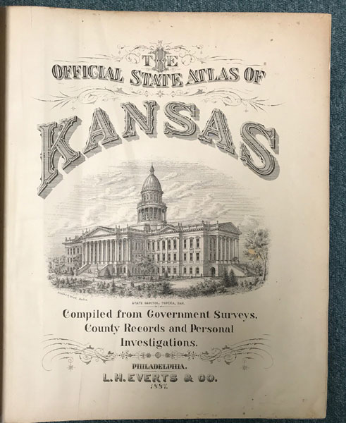First edition. Folio. 18" x 15" x 3" Original calf spine and corners and cloth, titles stamped in gold gilt on the front cover, 339 numbered pages (plus many more unnumbered pages of views), preface, illustrated by hundreds of colored maps and plates in black & white. Twenty-five colored folding maps. A large 30.9 cm. x 70,9 cm. [12 1/4" x 28"] folding map.This is the first large atlas for the state of Kansas. Includes detailed county maps, many hand-colored; township and city plats, showing landowners and property boundaries; illustrations and lithographs of buildings, farms, and towns; demographic, agricultural, and economic statistics; topographic and railroad maps; etc. Six Score 83 says "These atlases were designed so that pages could be tipped in. I doubt that any two copies are exactly alike." "This massive compilation contains a vast wealth of information on Kansas at the time of publication. Many of the views depict stock ranches, which are also located on the extremely detailed maps. There are many bird's eye views of towns and sights. Much of the accompanying text is devoted to listing the leading citizens of the state, their property, what kind of livestock they raise, and even what kind of fencing they use. The Everts' atlas is an important source for much information, with illustrations existing nowhere else." Rumsey 2818 says "The views show the remarkable development of the state over two decades after the Civil War." Dorothy Sloan states, "This atlas is rich in stock raising iconography and statistics. Many of the maps, which are certified as correct by various officials, locate ranches. Because of their large scale, the maps are quite detailed and show railroads, waterways, churches, cemeteries, and various features in the towns depicted. Numerous manufacturing establishments are also shown. The lithographed scenes, which were probably paid for by the owners of the properties depicted, show numerous prosperous farms, ranches, and town residences in their rural Victorian splendor. The detailed town maps are important documentation of a time when many of them were in their infancy. The importance of railroads in town development is obvious. The large folding map at the front was the best available map of Kansas at that time." Several pages in the "content" section of pages have small chips (repaired) with minor loss of lettering, also a few minor fore-edge repairs to the margin of a few pages at the rear of the volume, and some light cosmetic restoration to the front and rear leather corners of the covers, the maps and plates are in fine, bright condition, else a very good, tight copy of a beautiful cartographic production. The coloring is bright and this is a tough book to find in even good condition because of its size and weight.