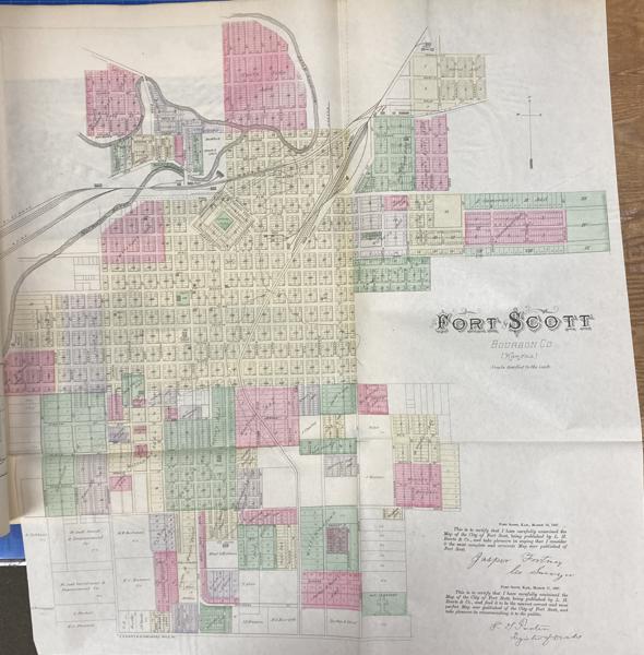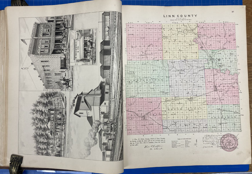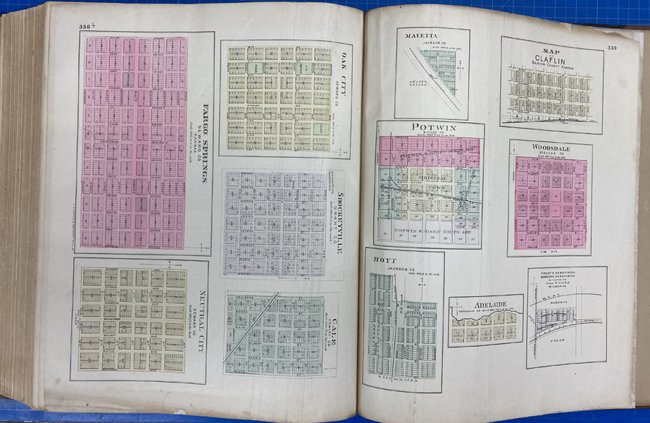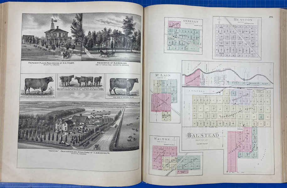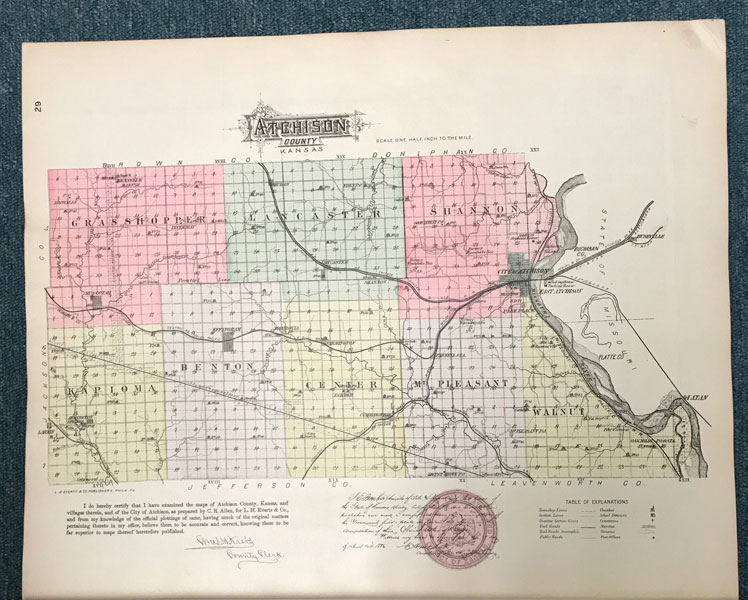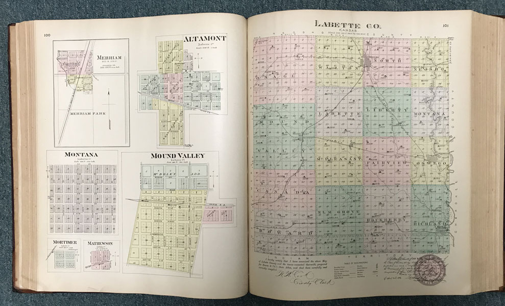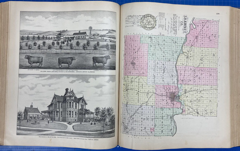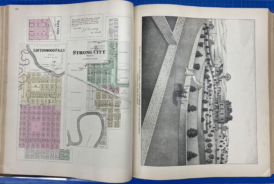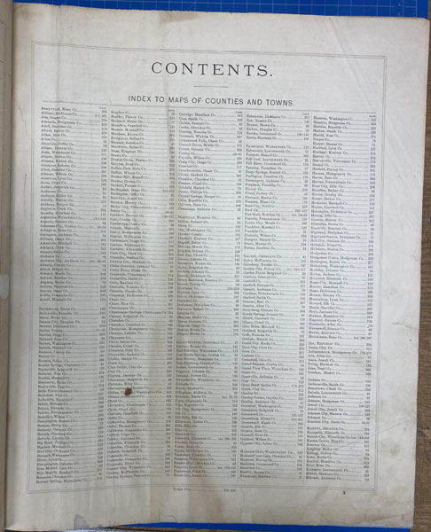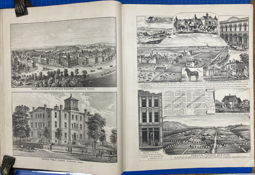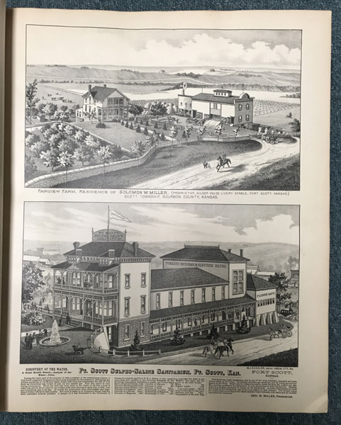 First edition. Folio. 18" x 15" x 3" Original calf spine and corners and cloth, titles stamped in gold gilt on the front cover, 339 numbered pages (plus many more unnumbered pages of views), preface, illustrated by hundreds of colored maps and plates in black & white. Twenty-five colored folding maps. A large 30.9 cm. x 70,9 cm. [12 1/4" x 28"] folding map.This is the first large atlas for the state of Kansas. Includes detailed county maps, many hand-colored; township and city plats, showing landowners and property boundaries; illustrations and lithographs of buildings, farms, and towns; demographic, agricultural, and economic statistics; topographic and railroad maps; etc. Six Score 83 says "These atlases were designed so that pages could be tipped in. I doubt that any two copies are exactly alike." "This massive compilation contains a vast wealth of information on Kansas at the time of publication. Many of the views depict stock ranches, which are also located on the extremely detailed maps. There are many bird's eye views of towns and sights. Much of the accompanying text is devoted to listing the leading citizens of the state, their property, what kind of livestock they raise, and even what kind of fencing they use. The Everts' atlas is an important source for much information, with illustrations existing nowhere else." Rumsey 2818 says "The views show the remarkable development of the state over two decades after the Civil War." Dorothy Sloan states, "This atlas is rich in stock raising iconography and statistics. Many of the maps, which are certified as correct by various officials, locate ranches. Because of their large scale, the maps are quite detailed and show railroads, waterways, churches, cemeteries, and various features in the towns depicted. Numerous manufacturing establishments are also shown. The lithographed scenes, which were probably paid for by the owners of the properties depicted, show numerous prosperous farms, ranches, and town residences in their rural Victorian splendor. The detailed town maps are important documentation of a time when many of them were in their infancy. The importance of railroads in town development is obvious. The large folding map at the front was the best available map of Kansas at that time." Several pages in the "content" section of pages have small chips (repaired) with minor loss of lettering, also a few minor fore-edge repairs to the margin of a few pages at the rear of the volume, and some light cosmetic restoration to the front and rear leather corners of the covers, the maps and plates are in fine, bright condition, else a very good, tight copy of a beautiful cartographic production. The coloring is bright and this is a tough book to find in even good condition because of its size and weight.