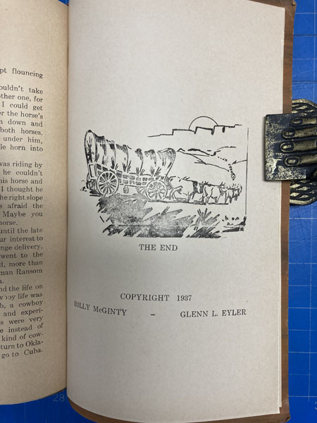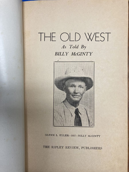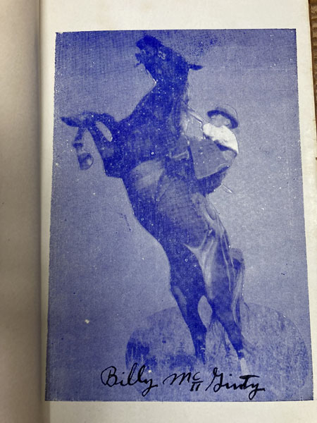 First edition. 8vo. Signed by Billy McGinty. Pictorial wrappers, 108 (2) pp., illustrated. Autobiography, as told to Glenn L. Eyler, of an old-time cowboy and broncho rider who worked on ranches in Texas, Oklahoma, New Mexico, Arizona, and Kansas. A scarce firsthand account of cattle drives and ranching in Oklahoma. Has information on some outlaws such as Tulsa Jack Blake and Arkansas Tom Jones. William M. McGinty also rode with Theodore Roosevelt's Rough Riders in the Spanish American War. He was a very early cowboy in movies, filming a bronc busting act for Paris World's Fair in 1889. McGinty's Cowboy Band was the first western string band broadcast in the U.S. when they played for KFRU radio station in 1925. Includes a chapter on his experiences as deputy sheriff in Clifton, Arizona, in the 1890's. Six Guns 1406: "Has information on Tulsa Jack Blake and other Oklahoma outlaws..." A rather scarce item these days, particularly signed, as this one is. McGinty has penned his name at the bottom of a portrait of him breaking a horse preceding the title page. Light wear to the fore-edges, else a near fine copy.