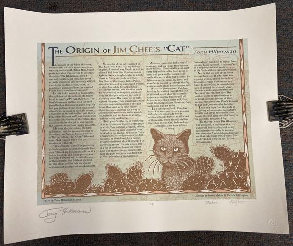 A broadside that measures 18" x 14 3/4," the published version is one of 60 copies, but this is an artist's proof, so designated by "AP" at the bottom of the text where it is also signed by Tony Hillerman, and both designers, Susan Makov and Patrick Eddington. The broadside is illustrated by Susan Makov. As new, unused condition. Suitable for framing.