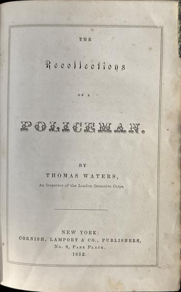 First edition. This is the true first American edition that was first issued as a pirated edition by Cornish, Lamport & Co. in 1852, with the text lifted from CHAMBER'S EDINBURGH JOURNAL and "some of our American Magazines." The first U. K. edition was published in 1856 as RECOLLECTIONS OF A DETECTIVE POLICE-OFFICER. The first authorized American edition was published in 1857 in Boston by Wentworth and Company. Thomas Waters was the pseudonym of William Russell. 8vo. Original burgandy cloth, decorated in blind on front and rear covers, titles stamped in gold gilt on the spine, 238 pp. preface. Queen 's Quorum 2 says this book is "the most important criminological yellow-back of its time." The first collection of British Detective stories and preceded only by Edgar Allan Poe's TALES in 1845, according to Queen's Quorum. Cloth lightly worn at spine ends, corners and extremities, cloth is lightly rubbed, former owner's name on front pastedown sheet, else a very good copy of a rare book.