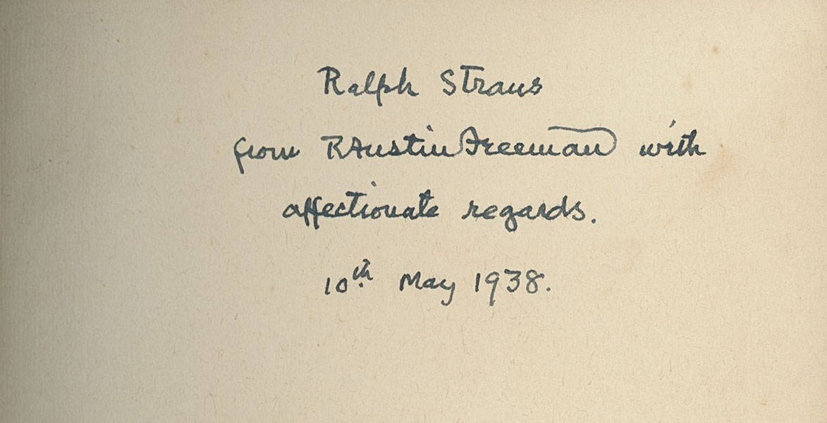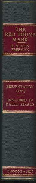 First edition of this Haycraft-Queen cornerstone title, the first Dr. Thorndyke book. Author's first mystery novel. Inscribed and signed by the author on the front free fly leaf. White lettering rubbed from the spine, as is common, with the white lettering on the front cover panel. In fine, bright condition with the red tumb print [said to be the author's own] on the front cover bright and colorful. First Dr. Thorndyke and one of the most important mysteries ever written. Haycraft-Queen Cornerstone title and described by Haycraft as "one of the undisputed milestones of the genre." Housed in a black cloth slipcase with red leather spine labels and titles stamped in gilt.