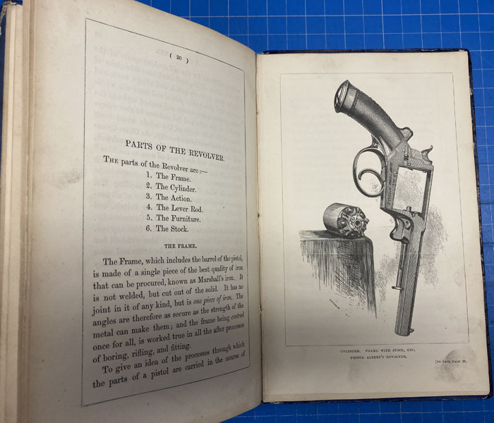 First edition. 8vo. Two-tone quarter cloth and pictorial paper over boards, [5], 57 [3] pp., frontispiece, illustrated, plates. The rifle and the revolver are nearly as old as the invention of firearms No one knows who invented them, where they were first introduced, nor even to which country they originally belong. Much important early information about the revolver. Some cosmetic touch-up to the spine ends, corners and extremities, internally clean and sound, else a good copy. Housed in a cloth clamshell case with titles stamped in gilt on the front cover and spine