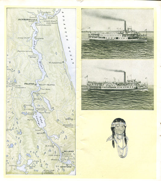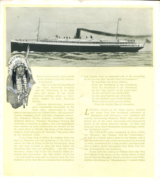 First edition. 8vo. 9" X 8" attractive, color pictorial wrappers, folded to 9" x 4," n. p. (28 pp. including covers), illustrated, maps. The Clyde Steamship Company operated year-round between Boston and New York and Jacksonville, Florida. They operated 22 steamers with all but two named for Indian tribes, and with an aggregated tonnage of 56,826 tons. Single panel color maps of the interior of Florida showing the inlet from the Atlantic Ocean to Jacksonville and the St. John River, and a color map of the whole of Florida. There is also a two-panel color map of the Clyde Line routes showing their routes along the eastern seaboard of the U. S. Photographs of some of the steamers and many of the passenger comforts provided including cabins, dining rooms, entertainment areas, etc. Light soiling to wrappers along with light wear to the extremities and edge. Very good. An attractive copy of an elusive booklet.