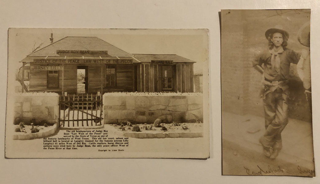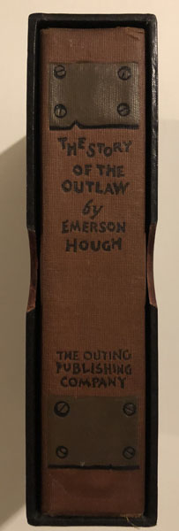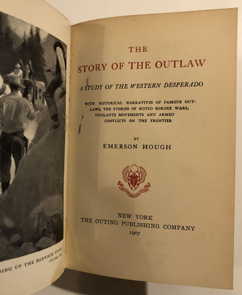 First Edition, First State with rules at top of page V. Pictorial Boards with Cloth spine. xiv, 401pp., illus. Hough wrote many works of fiction and non-fiction, many with a western setting, before he died in 1923. An early classic account of lawlessness in the West. Much misinformation. An attractive clean, tight near fine copy. Two photographs laid-in: one a photo postcard of the "old headquarters of Judge Roy Bean. The other a photograph of a long-haired man standing, in cowboy attire, with a pistol on his right hip. Although the bottom edge has been trimmed, it appears to be the name Eagle Jack written on the negative. Why these photographs are laid-in we are unsure of, but they remain with the book. Protected in custom slipcase.