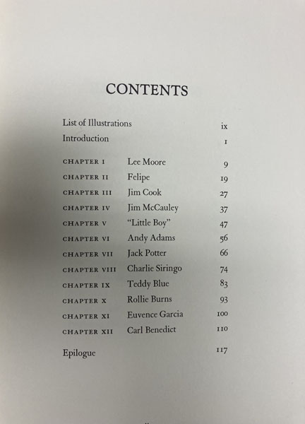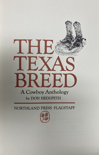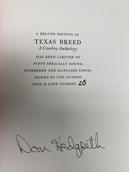 First edition. 8 vo. One of 50 specially bound, signed and numbered copies. This is copy 28. Publisher's quarter brown cloth and brown boards, gilt spine lettering, terra-cotta endpapers, ix [1], 120 pp., illustrated from photographs. A collection of stories about Texas cowboys. Jim Cook, Andy Adams, Jack Potter, Charlie Siringo, Teddy Blue, and Rollie Burns are among the cowboy/authors presented here. Fine, unread copy housed in the fine original slipcase.