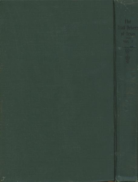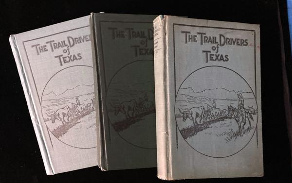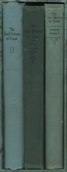 First editions. 3 volumes. Pictorial cloth, 498 pp., 496 pp., & 494 pp., frontispiece, portraits, advertisement. Also included: "Revised Volume 1", San Antonio: Globe Publishing Co., 1924. Revised, Second edition of Vol. 1. Pictorial cloth, 494pp., frontis, portraits, index. All three volumes were "published under the direction of George W. Saunders, President of the Old Trail Drivers Association. The original 2 volumes were very crudely printed and bound, making it very difficult to find copies that aren't loose and heavily worn. The first volume was exhausted before the second volume appeared; therefore it was reprinted in 1924 with some revisions and additions in an edition of 500 copies with a "second edition" imprint...In spite of the crudeness of the two volumes, they are perhaps the most important single contribution to the history of cattle driving on the Western trails."--Ramon Adams. In SIX-GUNS...Ramon Adams refers to the original edition as "rare" and the 1924 "second edition" as scarce. "This compilation is the essential starting point for any study of Texas trail driving days."--John Jenkins. "Absolutely the best source there is on the cattle trail"--Walter Prescott Webb. "This vast complication of original accounts by old trail drivers is one of the best cattle books, and the largest collection of first hand narratives of the range cattle industry."--Bill Reese. A rare and important work. The first volume is a very good, tight copy. Volume II is a very good, tight copy. The revised issue of Volume I is a very good copy. Housed in a sturdy cardboard slipcase.