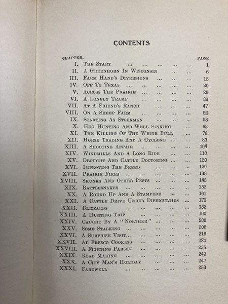 First edition. 8vo. Pictorial cloth, 252, [1]p. Preface, with illustrations including two by Remington [without credit], and from photographs. The author tells of his time in northwest Texas, cattle drive, a stampede, bad weather, etc. In a conversation some years ago Jeff Dykes said he had only two copies in 43 years as a bookseller and this is our first copy in 43 years as a bookseller. Extremely rare! A Remington rarity. This copy has the name and address of a Pollock on the front free fly leaf. Possibly a relative of the author. Very light foxing to the fore-edges, light wear to the spine ends else a very good copy of a range rarity. Housed in a cloth slipcase case with leather spine label and titles stamped in gilt.