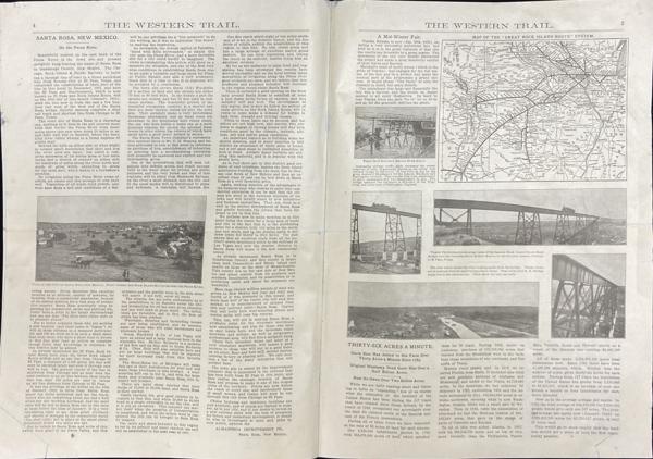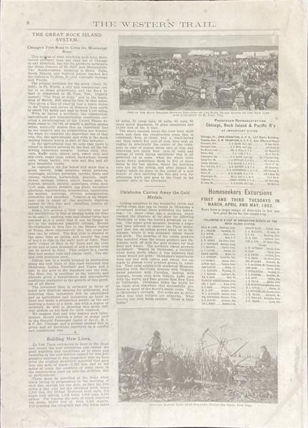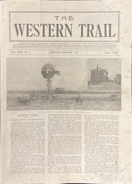 "The Western Trail is published by the Chicago, Rock Island & Pacific R'Y - The Great Rock Island Route - as a quarterly, and issued in the interests of the above named Company. Its endeavor will be to give its readers in considerable detail facts as to emigration, securing homes, and the industrial interests of the country traversed by THE GREAT ROCK ISLAND ROUTE, in the states of Kansas, Colorado and Texas and the Indian and Oklahoma Territories, and in a general way show the industrial interests in all the states traversed by this line. Copies for a year will be mailed free." ---- Quoted from The Western Trail.