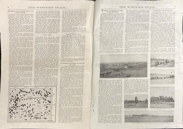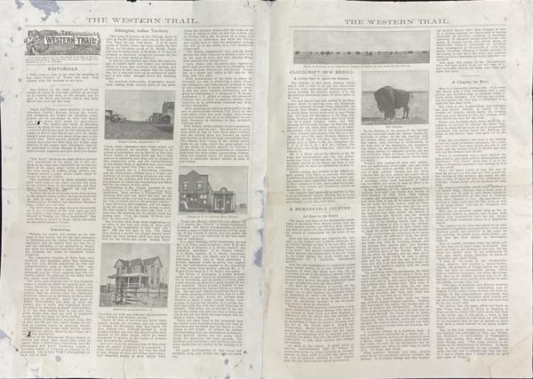 Features include the Seven-Six Ranch of W. D. Wagner, a few miles from Dalhart, Texas that shows a ranch scene with a wonderful view of a windmill in operation. Articles about towns in Indian Territory, New Mexico, Colorado, Oklahoma, and Texas with special coverage on Addington, Indian Territory, Cloudcroft, New Mexico, Santa Rosa, New Mexico, and Burlington Colorado, the county seat of Kit Carson County. Also some information on growing crops such as rice and broom corn. All in all an interesting newspaper for its day.