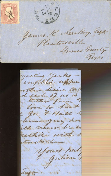 This three-page handwritten letter dated September 14, 1867, from Julian Ransone of Blakely, Georgia to James K. Markey, Plantersville, Texas. Ransone starts by expressing concerns for Markey's safety in Texas. It states: "We are in fear for you. Such lamentable accounts of Galveston and the whole Texas coast…" It then delves into a rather convoluted account of a land swap gone bad which was the genesis of the subsequent events. This resulted in a shootout between himself and a Dr. Christian. Ransone describes the gunfight in vivid detail stating: "…. I went into Blakely about 11 o'clock at night. I was standing with Dr. Ewell on the porch of his drug store when Christian came up….He said (having his pistol in his hand drawn) 'is the Capt. Ransone?' and fired immediately the ball struck me in the right hip….I walked down the steps towards him; he fired again shooting me through the leg just above the left ankle. When I stepped on the ground, I drew my pistol….at the same instant Christian jumped behind a tree. I said to him 'come out from behind there you d----d cowardly scoundrel and let us square this matter up;' he poked his pistol around the side of the tree and fired the third shot [flashing] by my cheek and neck. I bent my arm around the tree and fired; he shuffled away to another tree about 20 feet off; as he went around it I fired at him and as he peeped from the opposite side I fired again; he ran from this tree home and as he ran I fired three more shots after him….it was found that I had shot Christian through the right chest twice which astonished me greatly for the scoundrel ran so I did not think that I had touched him…." A civil case was filed against Ransone for libel and the "intelligent jury promptly returned a verdict for $6,000. Fortunately, they cannot find my money as easily as they do a verdict. Next April I am to be tried on the criminal side of the Court for libel and for 'shooting at another!' At the same time Christian will be tried for 'attempt at murder.'" A rare first-person account of a shootout by one of the participants. The handwriting is legible and except for the creases the letter is in very good condition. Also present is the original addressed and stamped envelope.