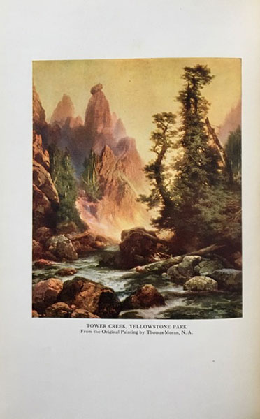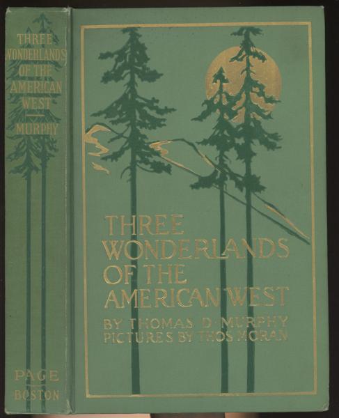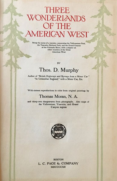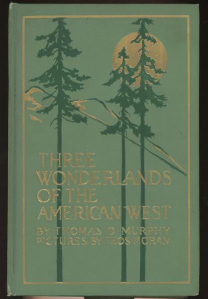 First edition. Tall 8vo. in light green pictorial cloth, illustrated on front cover and spine. Front cover shows trees against mountain landscape in dark green and gilt. [12], 180 pp. Color frontispiece. 15 color plates. 32 photo plates. 3 maps. A wonderfully illustrated automobile travelogue through the three great National Parks of the West. Light bumping to a couple corners along with occasional light toning. A very good bright copy.