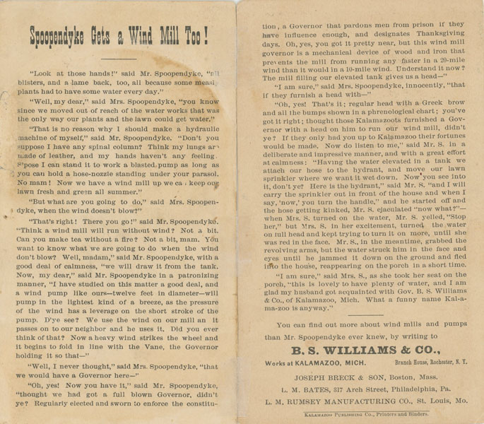 6" x 6 9/16" card folded in half to create to 4 panels. Two colorful cover panels - - one showing a woman with her parasol watering the crops with a hose as her husband is toiling at the pump. The second panel shows and man and his wife sitting on the front porch of their home while a sprinkler does the work. In background is a windmill. Two interior panels tell the story of poor Mr. And Mrs. Spoopendyke, a couple who is forced to do back-breaking work in order to get water to their crops. In January of 1867, Bradley S. Williams and his brother-in-law, Mr. Kirk Smith formed Williams, Smith & Co. in Kalamazoo, MI. The stated purpose to manufacture windmills and "reapers, mowers or threshers." In 1873, the two parted ways and Williams changed the name of the company to B.S. Williams & Co. By 1889, Kalamazoo was known as “The Windmill City” with a total of eight windmill factories in operation. Over 4,000 windmills were produced annually. B. S. Williams & Co. was the largest manufacturer and producing over 1,200 mills annually. Light soiling and with stamp to top of one scene. Panels have been neatly taped together. Very good.