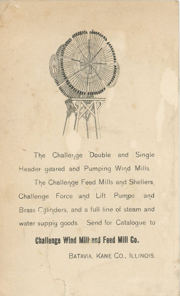 3 3/8" x 5 3/8" double-sided card showing two colorful scenes on front of card ... a town scene on one-half and a farm scene on the other half with both scenes showing windmills. Rear of card offers brief information about the Challenge Wind Mill along with showing an illustration of a windmill at the top of the card. The product line of the Challenge Company, founded in 1867, included their most famous product ... the windmill. By 1869, thirty or forty men were working for the company. In 1872, the factory burned but was soon rebuilt. Before long the company was turning out 2000 windmills a year in addition to other farm equipment. Salesmen carried samples of windmills as they toured the west by train, wagon, and later trucks, visiting farmers and extolling the virtues of windmills made in Batavia. The salesman took an order and telegraphed it back to Batavia. After the mill was manufactured, it was shipped in pieces by train to the customer. It would have to be assembled on the farmer’s land. Card lightly soiled with a 1/4" x 1/4" closed tear to edge and a small crease to one corner. Very good.