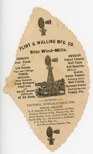 5 3/4" x 3 1/2" color fan-shaped card showing a young child on front of card and with products and addresses on rear and showing a windmill at top and bottom of card as well as a farm scene with a windmill at the center. In 1866, Flint & Walling began operations on the corner of Mitchell and Oak streets in Kendallville, Indiana. When first established, Flint and Walling built hand-operated water pumps as well as the Flint & Walling windmill, a revolutionary product that quickly spanned the globe. Their Star Wind Mill was patented in 1878. Unlike other windmills at the time, the Star turned counterclockwise. It played a crucial role in providing water to American homesteads and farms. Card lightly soiled and with a 1/4" closed tear at edge. Very good.