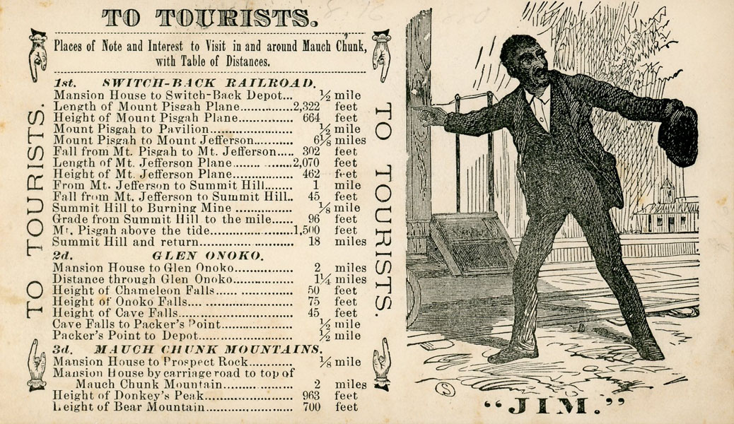 3.35" x 5.5" trade card on white cardstock, printed in black on both sides. This uncommon card advertises a curio shop located in the Mansion House Hotel in the Mauch Chunk, Pennsylvania. Later renamed Jim Thorpe, Mauch Chunk was a popular tourist destination offering beautiful mountain scenery, waterfalls, and an eight-mile switchback railway. The Mansion House stretched for 355 feet along the riverfront, and by the 1870s boasted five stories and accommodations for 400 guests. According to this card, the Switch-Back Bazaar and Curiosity Emporium offered local guidebooks photographs, and souvenirs, and as well as "Indian, Swiss, English, French, Japanese, and Other Curiosities and Fancy Goods" -- including baskets, fans, jewelry, canes, taxidermied birds and squirrels, gemstones, fossils, and more. The verso of the card provides tourists with a list of places to visit and table of distances and is illustrated with an image of "Jim," who appears to be the switch-back railroad conductor. Minor soiling, penciled date (8-16-1880); very good.