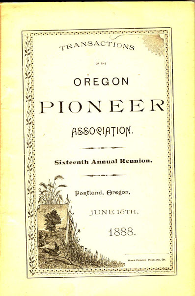 First edition. 8vo. 22 cm. Tan pictorial wrappers. 159 [1] pp., frontispiece, portrait. In addition to minutes, various addresses, letters, Secretary's Report, Treasurer's Report, etc. offers the Constitution of the Oregon Pioneer Association with its 16 Articles. Fifteen-page poem entitled, The Camp Fires of the Pioneers by Sam L. Simpson. Sixteen pages devoted to, "an interesting and comprehensive review of the period leading up to the formation of the Oregon Pioneer Association, and a synopsis of its transactions since that time, entitled The Pioneer. Also has the Annual Address Before Indian War Veterans, chapters on Mrs. Myra F. Eells, Homon Munson Humphrey, Mr. Orville Risley, Stephen Griggs Skidmore, and Edward Long, along with a portrait of Long. Most interesting is the 41-page chapter offering the complete diary of Rev. Edward Evans Parrish who crossed the plains in 1844. Front wrapper lightly soiled else near fine copy.