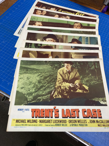 Each of the film's principal actors, Michael Wilding, Margaret Lockwood, Orson Welles, John McCallum, and Miles Malleson, appears on one or more of the color-tinted cards. Each of the cards includes the main film credits, including E.C.Bentley for the story and Pamela Bower for the screenplay. Except for some barely visible pinholes in the corner margins of the Title Card, all of the cards are bright, clean in near fine condition. Complete lobby cards sets of this vintage have become scarce. Handsome set.