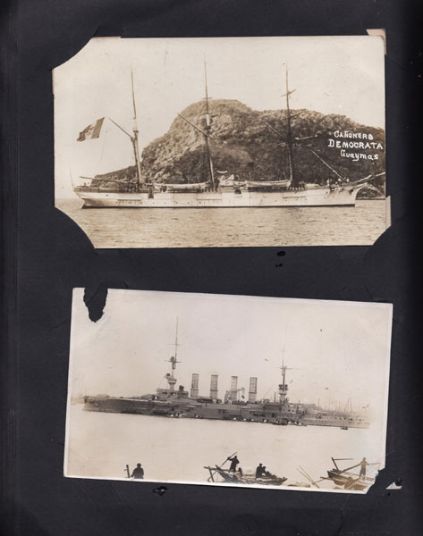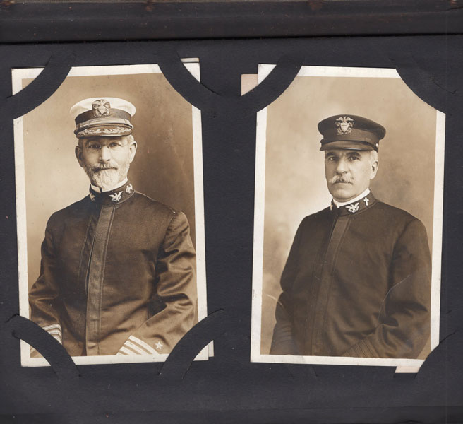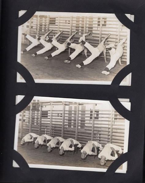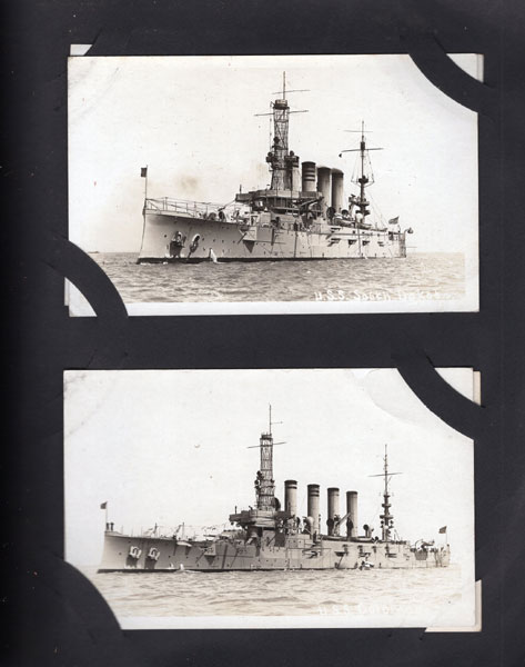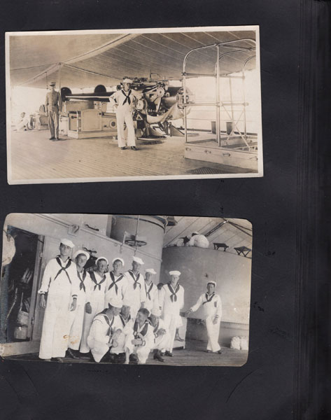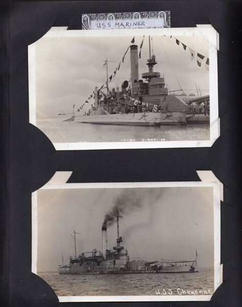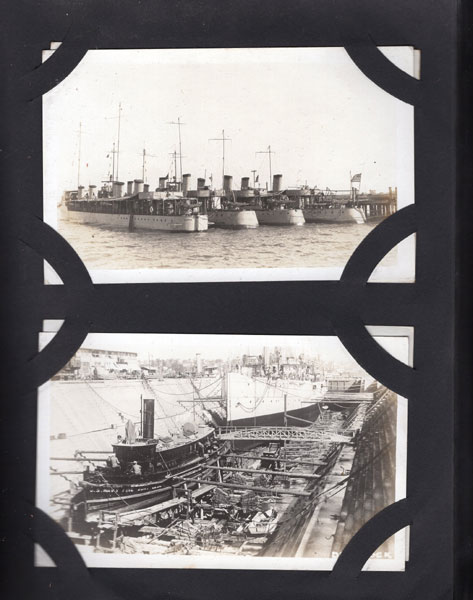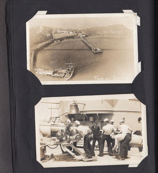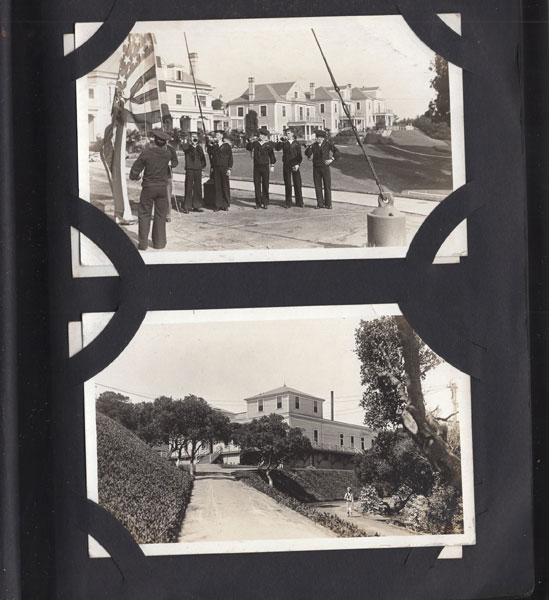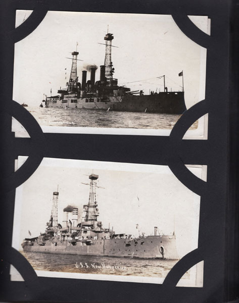 First edition. 8vo. 9 1/2" x 8 1/4" cloth bound binder with title stamped in gilt on the front cover, 128 leaves. Album of over 250 original RPPCs and photos relating primarily to the United States Navy, circa 1910s - 1920s. Includes 75 photographs of Navy ships and 42 views of sailor training and activities at Yerba Buena, California, including a scarce grouping of men doing physical exercises and drills. Most of the images are postcard size. The naval ship photographs include the U.S.S. Oregon, Milwaukee, Maryland, Hull, Cheyenne, Yorktown, Annapolis, New Orleans, Missouri, Ohio, Louisiana, Iowa, Wisconsin, Virginia, New Hampshire, Connecticut, Vermont, Kansas, Illinois, New York, Pennsylvania, Texas, Arkansas, S. Carolina, North Dakota, Utah, Delaware, Florida, Wyoming, Michigan, and the Pittsburgh. The photographs of the naval ship are quite remarkable. Other images include photographs of crew members, field training, drills, ship launching, on-deck activity, ship mascots, various ports, manning a machine gun, and family and friends. Nice, predominantly pre-WWI era naval photograph album. Most of the photographs are in near fine to fine condition.