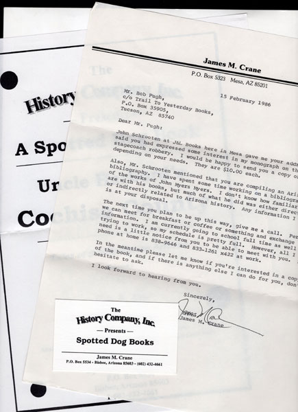 First edition. 8vo. Gift inscription on in side front cover and signed by the author. Also signed by the author on the title page. Limited to 500 copies. Printed wrappers, [2], 20 pp. Provides some history of Cochise County, Arizona in ten essays. Fine copy.
